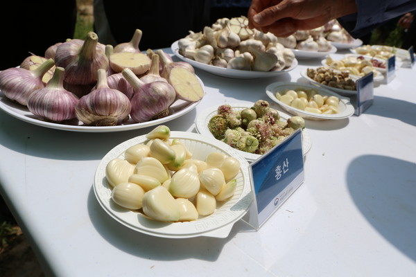 ‘홍산마늘’은 국립원예특작과학원 육성 꽃피는 마늘 유전자원을 이용해 교배 육종해서 2016년 품종 등록한 마늘 신품종으로, 국내 최초로 한지와 난지 모든 지역에서 재배가 가능하고 그 수량성도 남도마늘이나 기존의 재래종보다 우수해 농가와 소비자의 선호도가 매우 높은 품종이다.