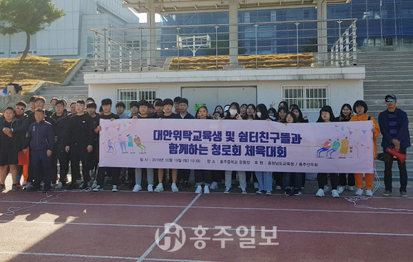 홍성군청소년자원봉사단 청로회(회장 이철이) 학생들과 쉼터 친구들, 대안위탁교육생들이 함께 지난 19일 홍주중학교 운동장에서 체육대회를 실시했다.<사진>