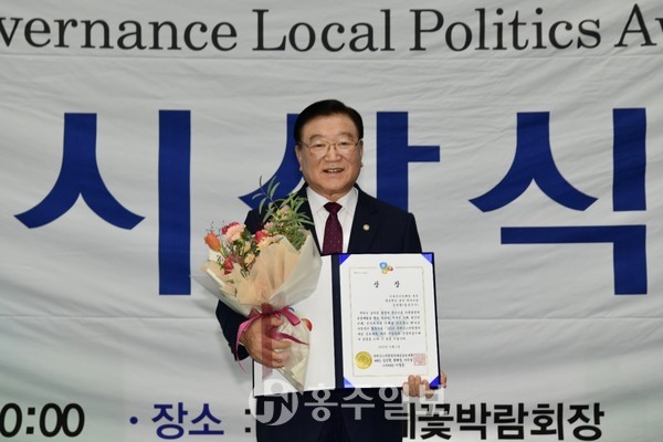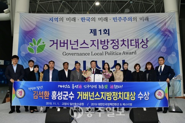김석환 홍성군수가 지난 1일 고양시 일산호수공원에서 개최된 ‘2019 대한민국정책컨벤션&페스티벌 지방정치대상’에서 지속가능한 농촌모델 제시로 행정혁신분야 최우수상을 수상했다.