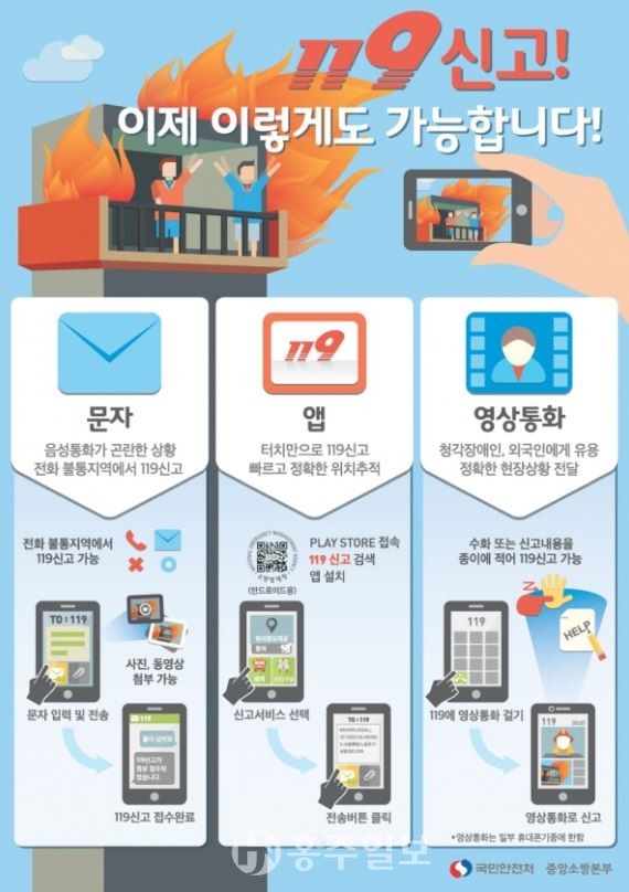 홍성소방서(서장 유현근)는 화재, 구조, 구급 등 재난 발생 시 음성 외에도 문자, 앱(App), 영상통화 등을 이용해 ‘119다매체 신고서비스’로 신고가 가능하다고 밝혔다.