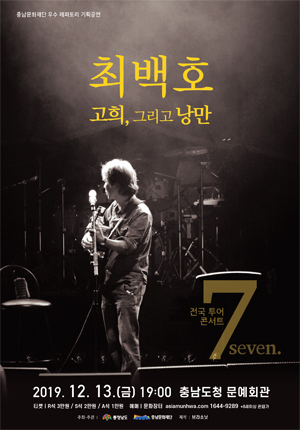12월 충남도청 문예회관 우수 레퍼토리 기획공연 최백호 송년 음악회 ‘고희, 그리고 낭만’은 영일만 친구·입영전야·낭만에 대하여 등으로 유명한 낭만 가객 최백호의 공연으로, 송년을 맞아 특별히 편성됐다. 한편 가수 최백호는 1976년 1집 ‘내 마음 갈 곳을 잃어’로 데뷔했으며, KBS 가요대상 남자가수상, 대한민국영상음반대상 본상 등을 수상했다. 현재도 7집 ‘7’을 발매하는 등 왕성한 활동을 이어가고 있다.