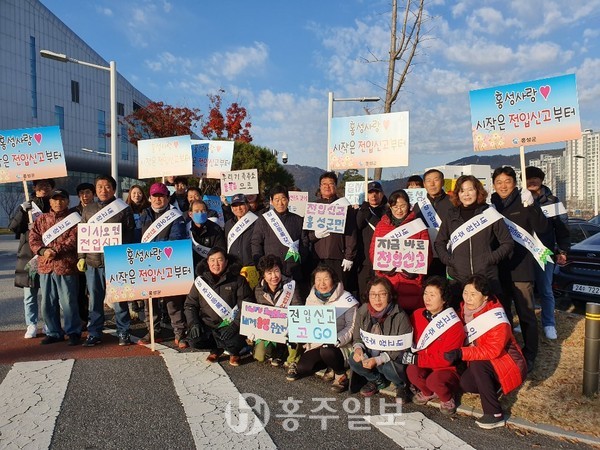 내고장 주민등록 갖기 운동은 지난 9월 내포신도시 아파트를 대상으로 처음 시작된 운동이다. 이어 지난 22일 두 번째로 열린 이번 운동은 아침 출근시간대 충남도청, 충남교육청 등 각 기관 청사 차량 입구에서 홍북읍 직원, 새마을남녀지도자, 바르게살기위원회 위원 등 약 100여 명이 참여해 어깨띠와 피켓을 착용하고 출근하는 직원들을 대상으로 전입신고를 홍보했다.