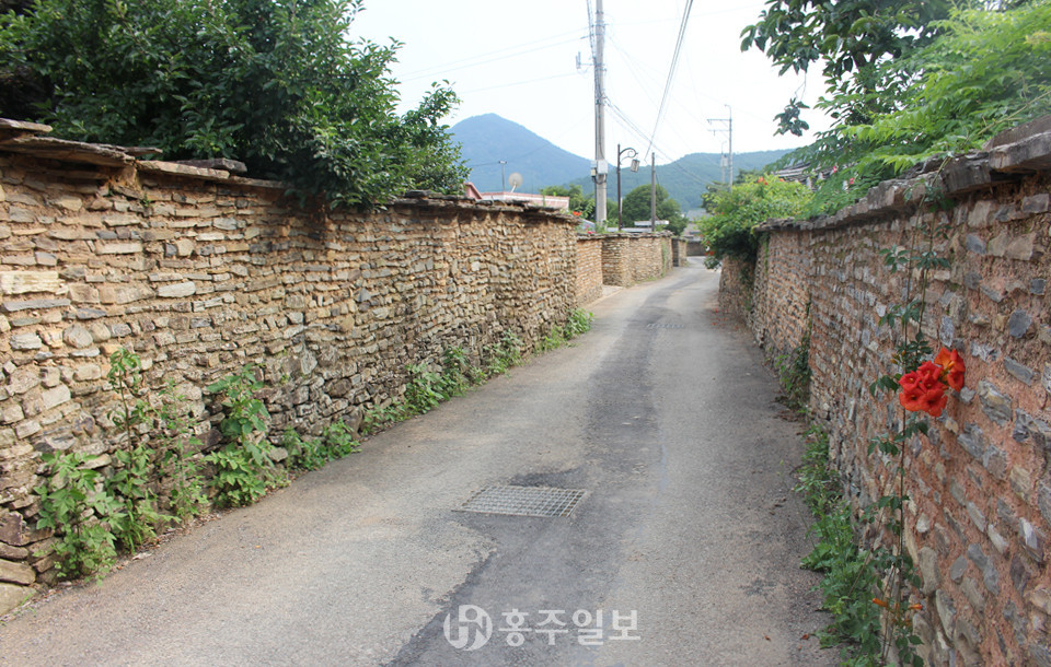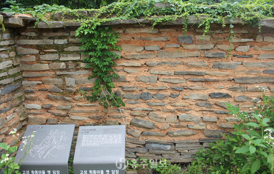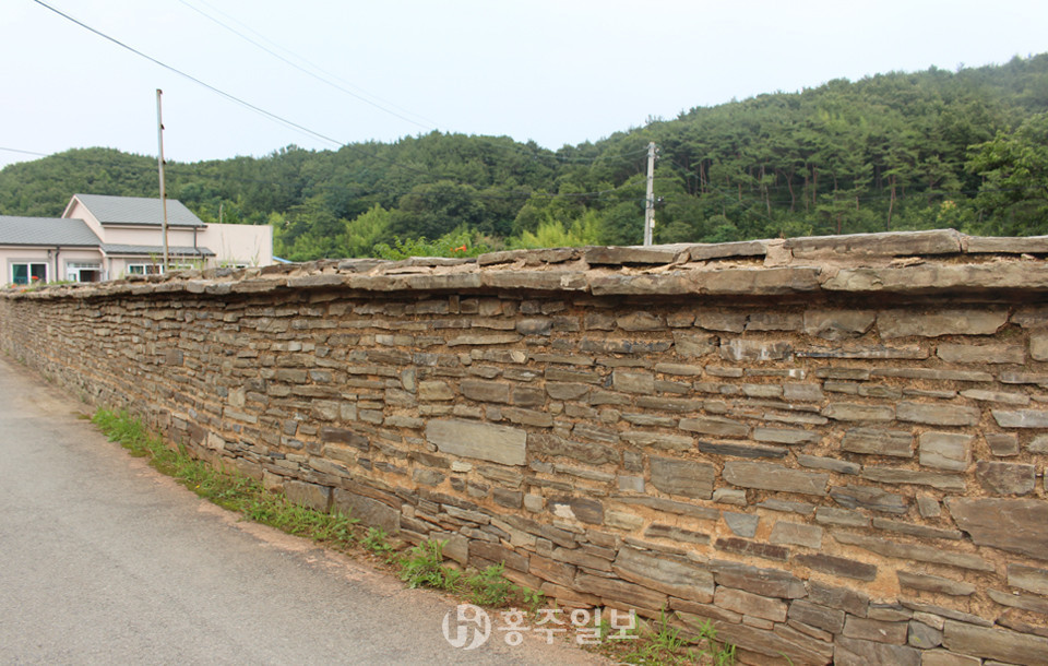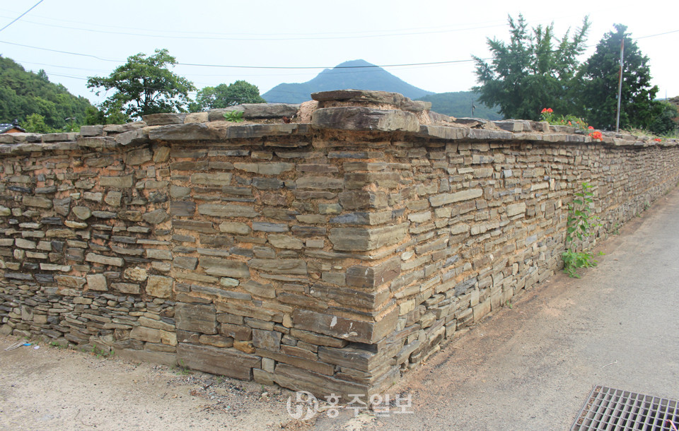 마을을 개척하며 점판암 돌과 황토 흙으로 바른층쌓기 돌담 예술적