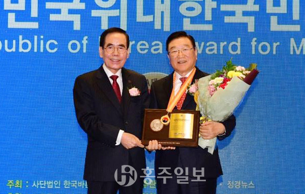 김석환 홍성군수가 지난 19일 서울 여의도 국민일보 빌딩에서 (사)한국바른언론인협회(이사장 최재영)가 주최한 ‘2019년 제1회 대한민국 위대한 국민대상’에서 지역발전 부문 대상을 수상했다.<사진>