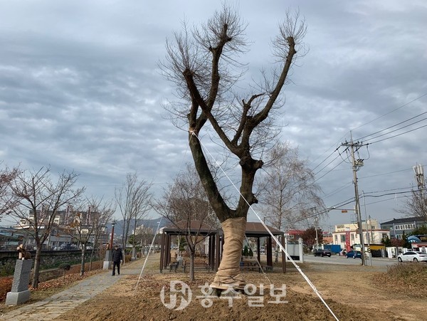 홍성군은 지난달 말 천주교 역사공원 내 식재되었던 기존 보호수(팽나무)에 준하는 대체수목의 이식을 완료했다.