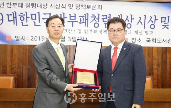 홍성군의회 김헌수 의장의 올바른 의회상 정립과 청렴한 사회만들기에 기여한 공로가 인정받았다.<사진>