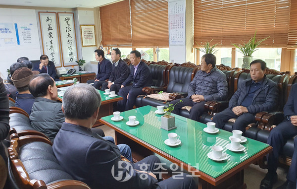 지난달 27일 홍성군청 군수실에서 김 군수와 이흥종 갈산면장, 갈산면 이장단협의회(회장 이기한), 각 기관단체장, 오두마을대책위(안창호) 위원 등 30여 명이 참석해 현안에 관한 이야기를 나눴다.