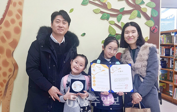 홍성도서관(관장 안영숙)은 지난달 24일 2019년 '책 읽는 가족'으로 선정된 이승복, 윤혜경, 이연서, 이연우 가족에게 인증서와 현판을 전달했다.