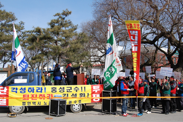 한편 홍성군내 법인택시 근로자들은 오는 17일까지 3일간 군청 앞에서 집회를 갖고 군에 강력히 항의한다는 계획이다. 또 이틀 만에 바뀐 홍성군 행정에 대해 행정소송을 제기한 상태다. 이와 함께 집회 후 군이 근로자들의 요구를 받아주지 않을 경우 생존권 사수를 위해 1인 릴레이시위와 단식투쟁 등도 병행할 예정이라고 전했다.