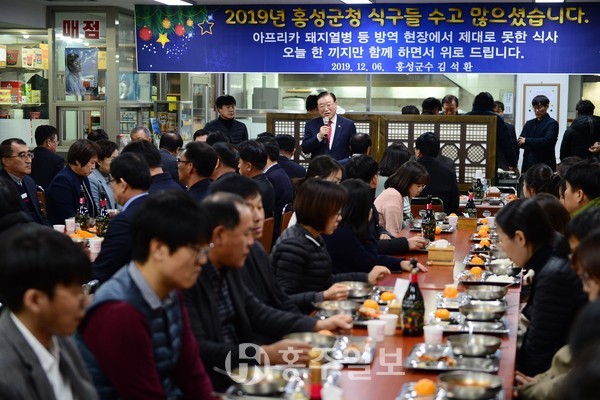 김석환 군수는 지난 6일 홍성군청 구내식당에서 본청직원 및 읍·면장 등 400여 명의 직원들에게 국밥과 떡, 과일 등 따뜻한 한 끼 식사를 제공하며 한 해 동안 군정 발전을 위해 노력한 직원들을 위로했다.