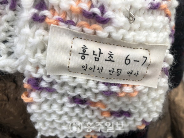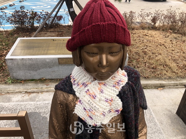 홍성읍에 위치한 평화의 소녀상이 매일 교체되는 새 목도리와 함께 따뜻한 겨울을 보내고 있다. 홍남초등학교(교장 최재길) 6학년 7반 학생들이 뜨개질 봉사로 만든 목도리다.