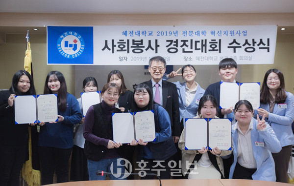 혜전대학교(총장 이세진)는 혁신지원사업의 일환으로 지난 10일 사회봉사경진대회 시상식을 본교 본관에서 시행했다. 경진대회는 최근 1년간 봉사활동을 한 결과를 발표하는 대회로 언어치료과 시나브로팀이 최우수상을 수상했다.