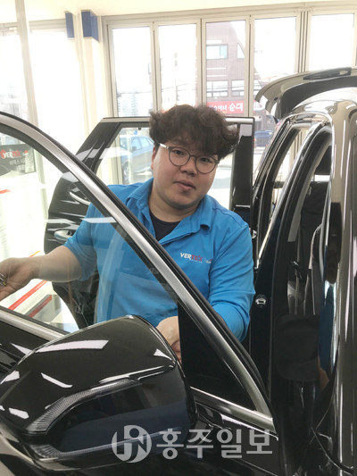 "고객 차량 썬팅 작업 중이죠. 아마 마음에 들어 하실 겁니다."