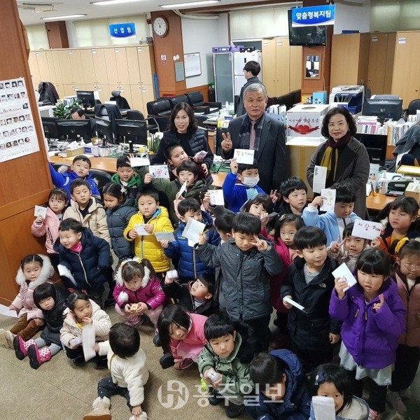 갈산어린이집(원장 김경옥) 50명의 원아들이 지난 17일에 1년 동안 고사리 손으로 모은 동전 60만5730원을 기부해 화제가 되고 있다. 3년째 갈산면행정복지센터를 직접 방문해 기부를 이어오고 있는 아이들은 이날 모은 동전을 직접 전달하고 이흥종 갈산면장과 함께 사진으로 추억을 담았다.