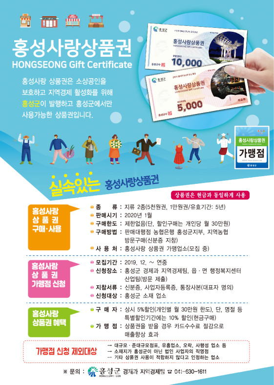 한편 홍성군은 오는 27일부터 가맹점 모집에 들어가며, 연중 수시로 가맹점 신청을 접수할 예정이다. 가맹점 지정을 희망하는 사업주는 사업자등록증 및 통장 사본을 지참해 홍성군청 경제과 지역경제팀 또는 가까운 읍·면 행정복지센터 산업팀을 방문하면 된다.