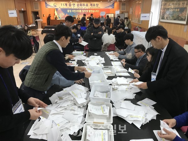 홍성군청사입지선정위원회는 26일 군청대강당에 11개읍면 순회투표 개표장을 설치하고 선관위, 참관인, 경찰관 등의 입회하에 개표요원들이 오전 10시부터 11개읍면 순회투표함 개표결과를 집계중이다.<사진>