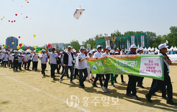 홍성군은 지난 11일 인천대학교 제물포 캠퍼스에서 개최된 ‘제11회 재인천 충남도민체육대회’에서 ‘충남·대전 혁신도시 지정 특별법 통과 촉구 서명운동’을 전개했다. 혁신도시는 세종특별시 출범을 이유로 수도권을 제외한 전국시도 가운데 유일하게 충남만 제외돼 있으며 그로 인해 충남은 경제적인 손실, 인구유출, 지역인재채용 불이익 등 심각한 홀대와 역차별을 받고 있다.
