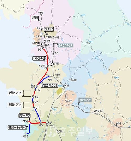 장항선 개량 2단계 건설사업의 홍성 신성~광천~보령 주포 구간 노선이 기존 선로를 직선화하는 방향으로 정해진 것으로 알려졌다. 이 구간은 지난 수년 간 노선과 석면 문제를 둘러싼 갈등으로 표류되고 있었던 만큼 사업이 다시 궤도에 오를 수 있을지 관심이 집중되고 있다. 충남도 관계자는 “장항선 복선전철화 사업도 2022년 완공을 목표로 추진되고 있기 때문에 올해 중으로 착공할 수 있도록 만전을 기하겠다”고 밝혔다.