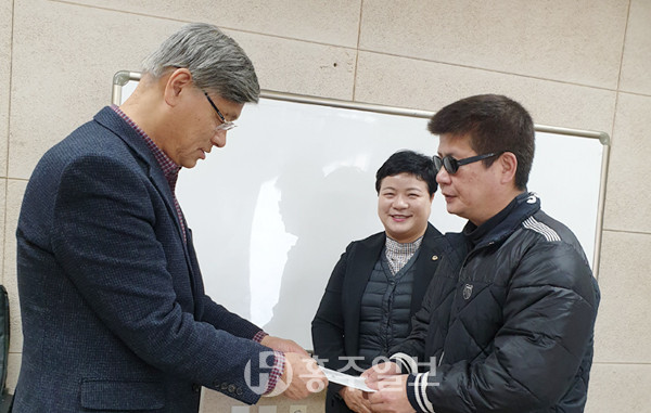 홍주새마을금고 오세승 이사장은 지난 18일 홍성시각장애인연합회(회장 오광택) 사무실을 방문해 50만원의 후원금을 기증했다.<사진>
