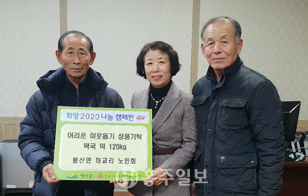 예산군 봉산면 마교리노인회(회장 홍의대)는 신정을 앞둔 지난 24일 어려운 이웃에게 전달할 떡국 떡 120kg을 봉산면행정복지센터에 기탁했다. 마교리 노인회는 지난해부터 떡국 떡 기탁 봉사를 진행하고 있다.