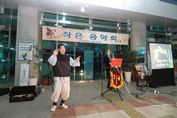 홍성의료원(원장 김진호)은 지난 8일 6시부터 한 시간 반 동안 의료원 1층 로비에서 ‘작은 음악회’를 열었다. 이번 홍성의료원에서 열린 ‘작은 음악회’는 색소폰 연주를 통하여 환자와 보호자에게 마음의 위안을 주기 위한 것으로 홍성 색소폰 동호회와 연계하여 매월 둘째 주 수요일마다 병원 로비에서 열릴 계획이다. 색소폰 동호회 이은영 씨의 진행으로 장밋빛 스카프, 동백아가씨 등 주옥같은 옛 노래들을 연주해 환자와 환자 보호자들에게 큰 박수를 받았다. 홍성의료원 김진호 원장은 지난 홍성의료원 슬로건 선포식에서 환자의 마음을 치유할 수 있는 작은 노력으로 매월 2회 ‘작은음악회’를 열어 몸과 마음을 함께 치유할 수 있는 병원이 되고자 노력하겠다고 밝힌 바 있다.