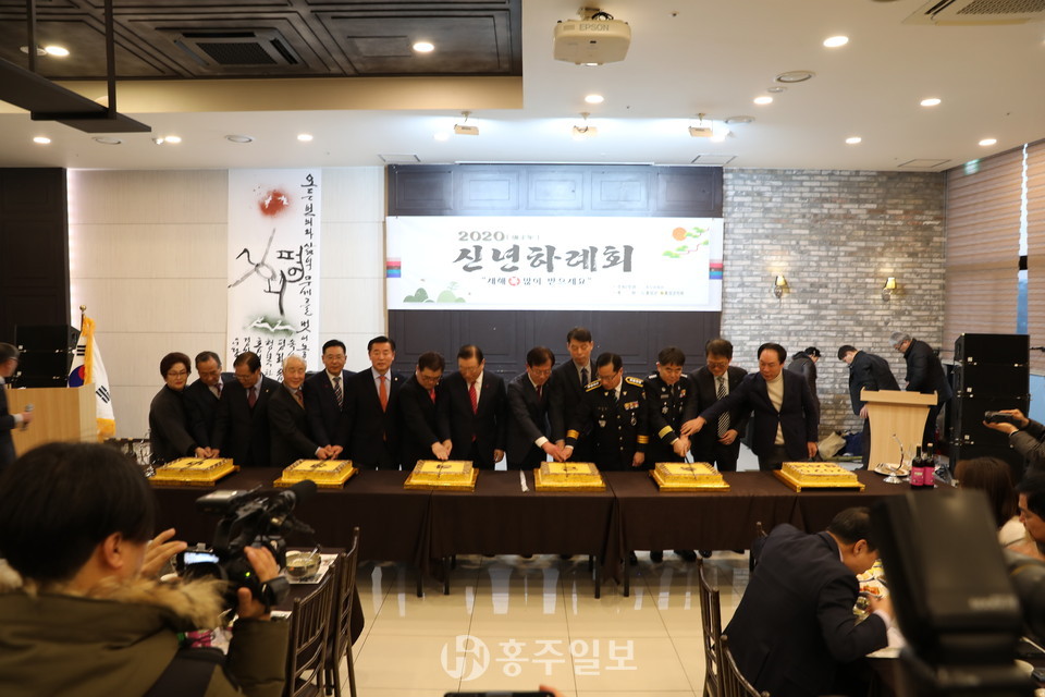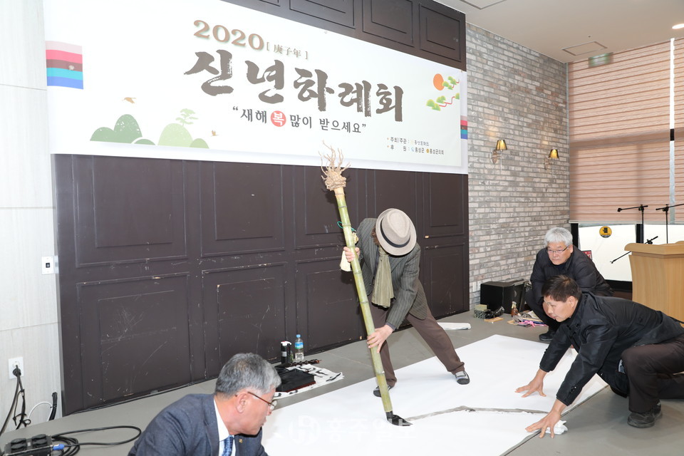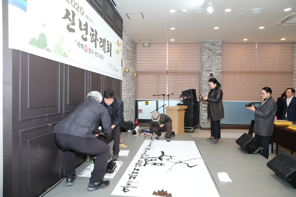 이어 각급 지역단체장들과 경자년 새해를 맞아 덕담을 나누며 희망찬 새해를 기원하는 축시 낭송과 새해희망을 다짐하는 내포콰르텟의 연주에 이어 우당 이봉연 서예가의 신년 휘호와 축하 케익 절단과 건배의 순으로 경자년 새해를 다짐했다.