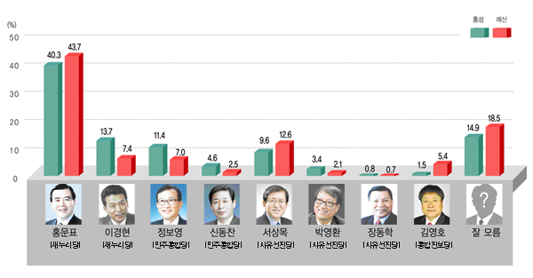 예산 홍문표 43.8%·서상목 14.3% ·정보영 6.2%·김영호 9.3% 순