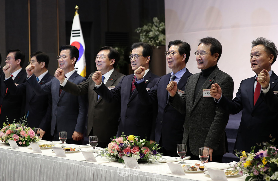 양승조 충남도지사는 16일 충북 청주 메리다웨딩컨벤션에서 열린 ‘2020 충청권 중소기업인 신년인사회’에 참석, 주요 인사들과 덕담을 나누며 소통했다.