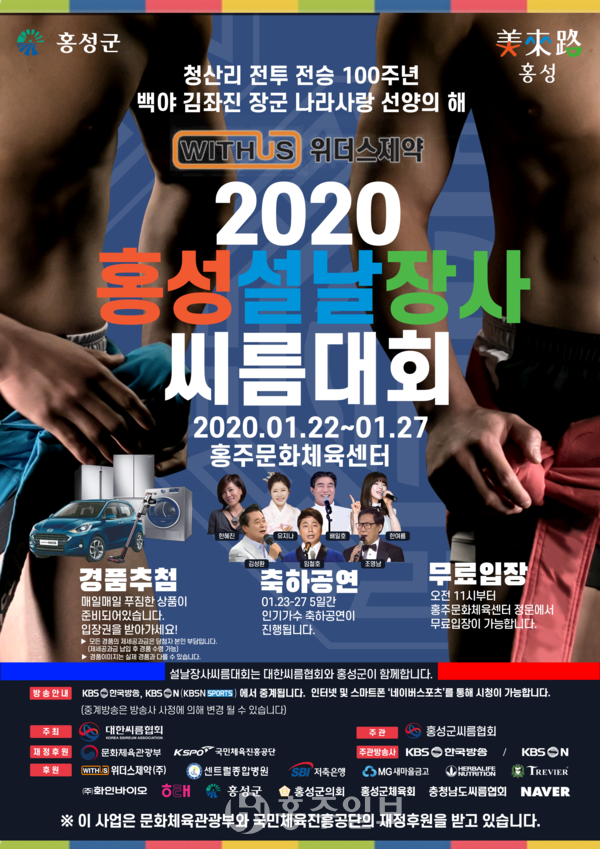 홍성군은 올 해 청산리 대첩 100주년을 맞아 ‘백야 김좌진 장군 나라사랑 선양의 해’로 선포하고, 이를 기념하고자 오는 1월 22일부터 27일까지 ‘위더스 제약 2020 홍성 설날장사 씨름대회’를 개최한다.