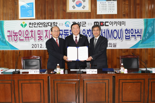 이날 협약식에는 김석환 군수를 비롯해 이문호 천안연암대학 총장, 이주갑 (주)MBC아카데미 대표이사 등 관계자가 참석해 귀농인 유치와 귀농인의 성공적인 정착을 위한 교육, 정보교환, 다양한 시책 개발 등을 3자가 협력 추진해가기로 했다.