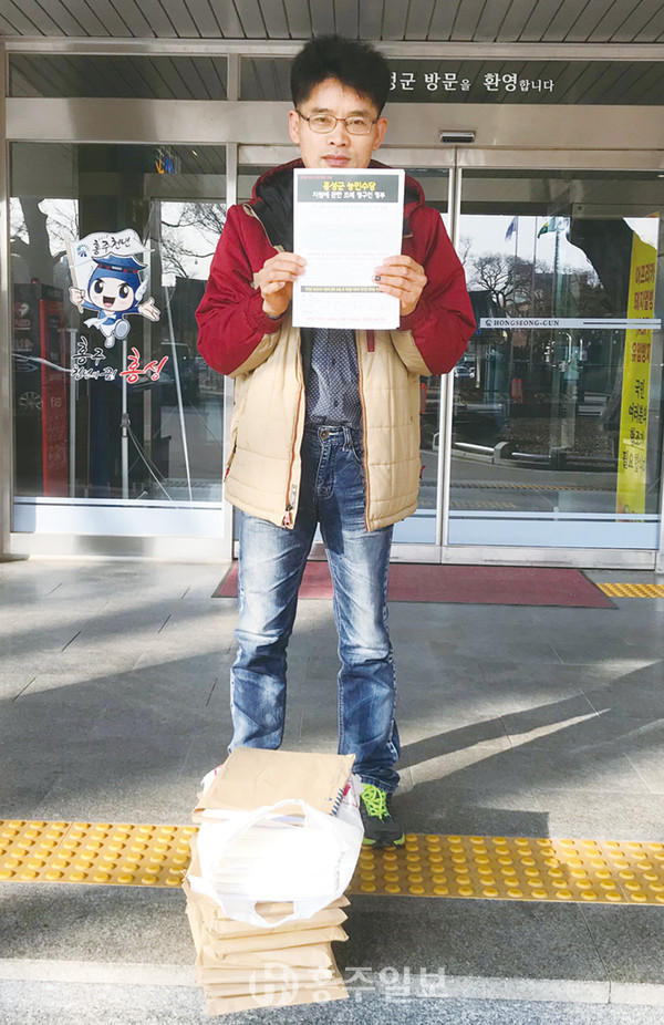 홍성의 농업인 단체와 사회단체로 구성된 ‘홍성농민수당운동본부(대표 김선태, 이하 농민수당본부)’ 김오경 사무국장은 지난달 31일 ‘홍성군 농민수당 지원에 관한 조례(안)’과 청구인을 접수한 지 3개월여 만에 필요한 청구인 수를 훌쩍 넘는 인원의 서명용지를 홍성군에 제출했다.