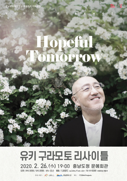 충남문화재단은 오는 26일 오후 7시, 충남도청 문예회관에서 우수 레퍼토리 기획공연 유키 구라모토 리사이틀 <Hopeful Tomorrow>를 개최한다고 밝혔다.
