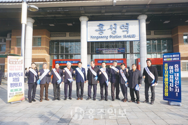홍성군지역발전협의회(회장 류철호)는 지난 23일 홍성역 앞에서 설 명절 귀성객들을 대상으로 회원 및 홍성군, 홍성군의회 관계자 100여 명이 함께한 가운데 민관 합동 혁신도시 지정촉구 캠페인을 펼쳤다.
