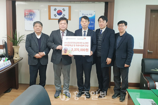 홍성교육지원청(교육장 주도연)은 지난 5일 교육장실에서 월드비전 대전세종충남지역본부(본부장 정유신)로부터 ‘사랑의 빵 동전 모으기 캠페인’ 모금액 30%를 지역교육지원 사업비로 전달 받았다. 2019년에 모금된 수익금 중 237만원을 홍성지역장학금, 특화사업비로 전달받았다.