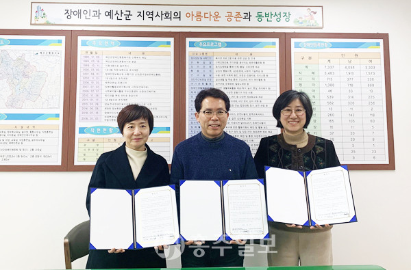예산군장애인종합복지관(관장 임덕규)과 예산언어심리발달센터(센터장 장혜정), 열림아동가족상담센터(센터장 이은정)는 충남사회복지공동모금회 지원 사업 ‘소통을 통한 행복 울타리’ 사업을 통해 지역사회 복지증진을 도모하기 위해 지난 11일 예산군장애인종합복지관에서 업무협약을 체결했다.