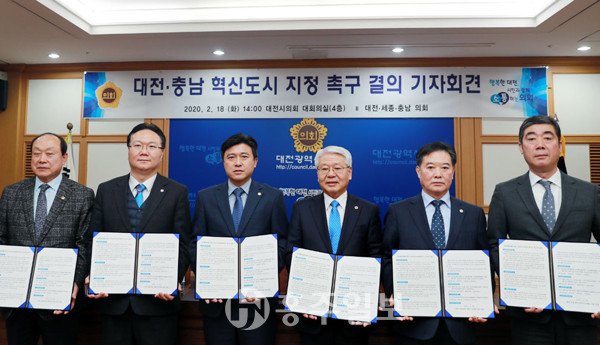 충청권 3개 시·도의회는 지난 18일 대전시의회 회의실에서 ‘국가균형발전특별법 개정안’ 이달 임시국회에서 반드시 통과시킬 것과 대전·충남 혁신도시 지정 촉구 결의대회를 가졌다.