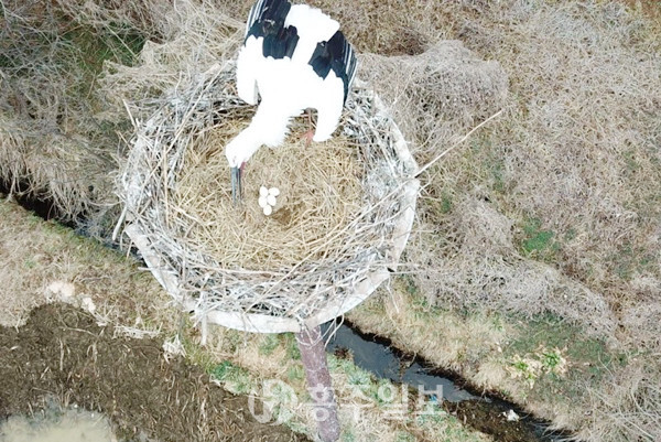 광시면 장전리 둥지탑에서 지난 13일 산란알 5개가 확인돼 황새가 자연 번식을 준비 중인 것으로 확인됐다.
