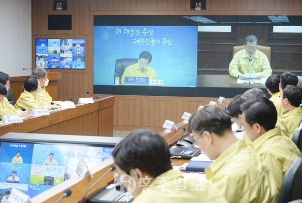 양승조 충남지사가 신종 코로나바이러스 감염증(코로나19) 확산을 억제하기 위한 대책을 문재인 대통령에게 건의했다. 양 지사는 지난 23일 도청에서 열린 ‘코로나19 대응 중앙사고 수습본부 영상회의’에 참석, 문 대통령에게 지역사회 감염 예방을 위한 대학교 개강 연기를 요청했다.
