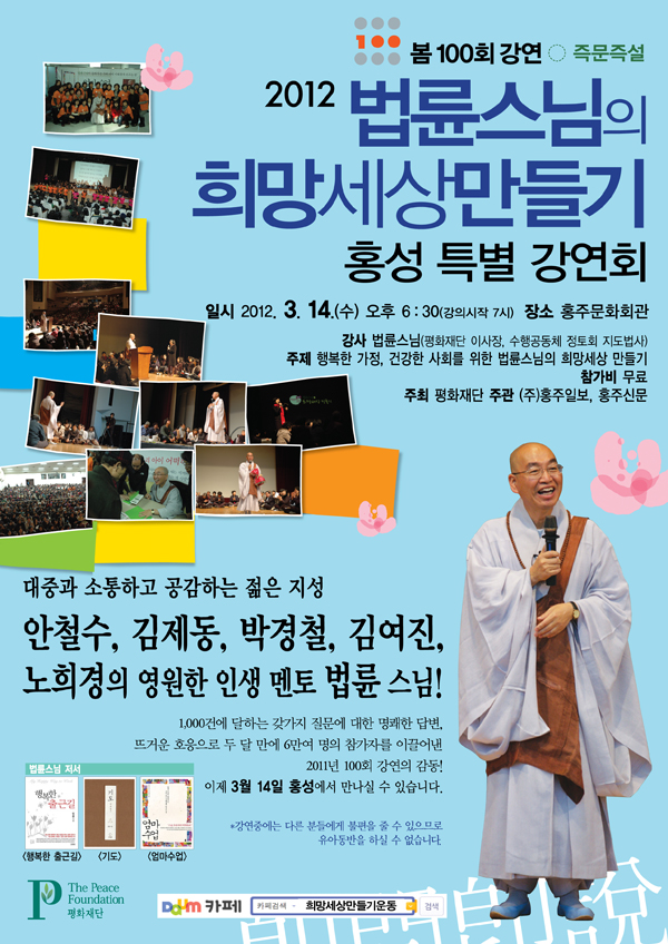 2012 법륜스님의 희망세상만들기 - 홍성특별강연회일시 : 2012년 3월 14일 오후 6시 30분(강의시작 7시)장소 : 홍주문화회관 저작권자 © 홍주일보 무단전재 및 재배포 금지 홍주신문 다른기사 보기 페이스북 카카오톡 URL복사 기사공유하기