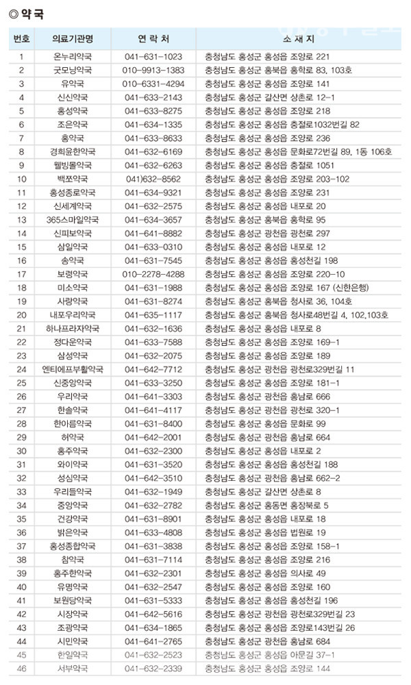 약국도 정부가 지정한 공적판매처 중 하나다. 홍성군 소재 약국은 46곳이다. 홍성읍 조양로에 한 약국의 약사는 “내일(29일) 첫 물량이 공급될 예정이며, 약국마다 마스크 100장 씩 배분받게 됐다”고 밝혔다.