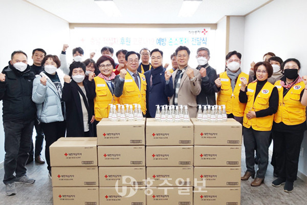 충남적십자 희망나눔봉사회(회장 최규복)는 홍성군지역사회보장협의체(공동위원장 이용환)와 함께 코로나19 확산 예방을 위해 지난달 27일 내포신도시 J컨벤션웨딩에서 관내 아동센터·요양시설 등 48개소를 대상으로 손소독제 600개(600만원 상당)를 전달했다.
