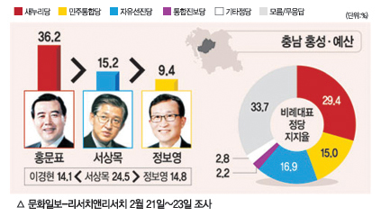 하지만 이경현 후보가 새누리당 후보가 될 경우에는 자유선진당 서상목 후보(24.5%)가 1위로 올라서는 것으로 나타났다. 서상목 후보는 2위인 정보영 후보(14.8%)에 9.7%포인트, 3위 이경현 후보(14.1%)에 10.4%포인트 앞섰다. 특히 서상목 후보는 자유선진당 지지층에서 61.2%의 압도적 지지를 받고, 새누리당 지지층에서도 25.4%를 얻는 것으로 조사됐다. 홍문표 후보가 나설 경우 새누리당 지지층을 안정적으로 유지하면서 자유선진당 지지층을 상당 부분 빼앗아오는 것과 상이한 결과다. 새누리당 후보 적합도 조사에서도 홍문표 후보가 42.4%의 지지를 얻어 7.9%에 그친 이경현 후보를 압도적으로 앞서는 것으로 조사된 점도 공천을 앞둔 상황에서는 관심사다. 한편 홍성·예산 지역의 비례대표 정당 지지율은 새누리당 29.4%, 선진당 16.9%, 민주당 15.0%, 통합진보당 2.2% 순으로 조사됐다고 보도했다.