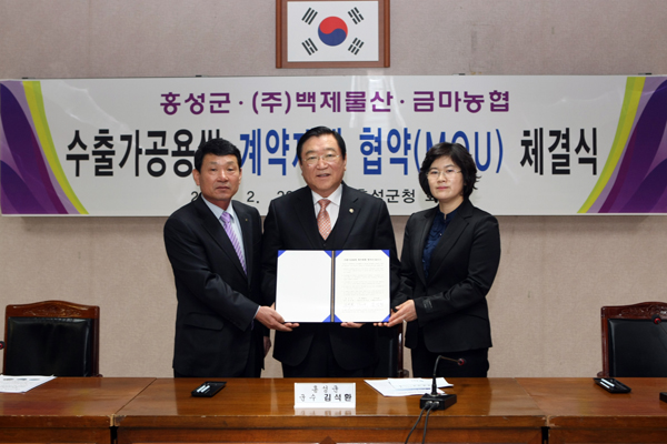 지난달 29일 오전 9시 30분 홍성군청 회의실에서는 김석한 홍성군수를 비롯해 지역의 쌀가공 전문기업인 백제물산(주) 김미순 대표이사, 금마농협 김영제 조합장 등 관계자 등 10여명이 참석한 가운데 수출가공용쌀 계약재배 협약서 체결식을 개최했다.