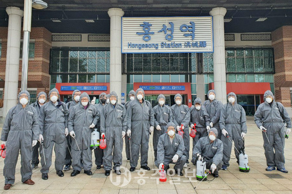 사)대한노인회 홍성군지회(지회장 조화원) 읍면 분회장 및 직원 24명은 코로나19 예방을 위해 지난 17일 관내 유동인구가 많은 홍성역을 비롯한 버스터미널, 홍성농협, 농협하나로마트, 농협 홍성군지부, 하나빌딩, 하나은행 등에 방역활동을 실시했다.