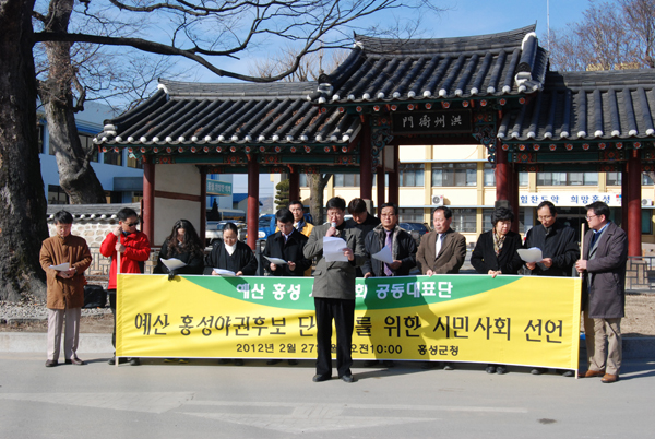 19대 총선 야권후보 단일화를 촉구하는 홍성·예산 시민사회 공동대표단의 선언이 지난달 27일 오전 홍성군청 앞에서 열렸다.