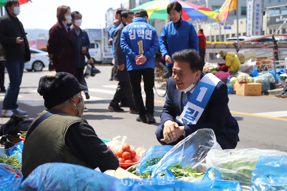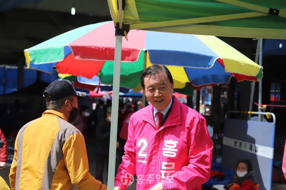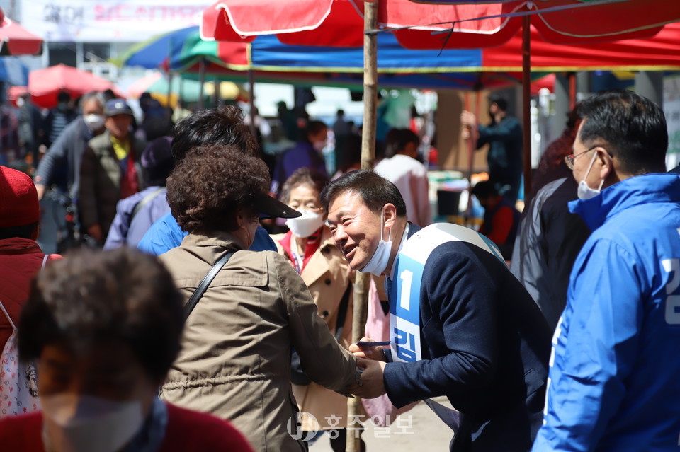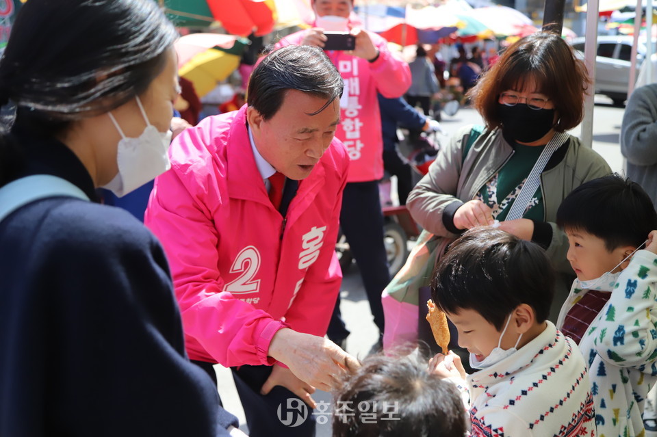 4·15 총선을 열흘 앞두고 충남 홍성·예산 지역구 국회의원 선거에 출마한 김학민 후보(더불어민주당)와 홍문표 후보(미래통합당)가 오늘(6일) 홍성전통시장 일원에서 선거 유세를 펼쳤다.