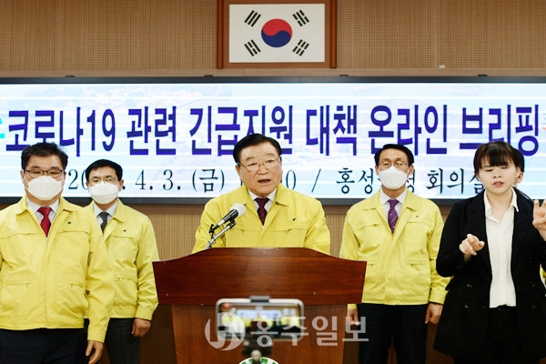 홍성군은 ‘코로나19 긴급 생활안정자금 등 지원대책’을 발표했다. 김석환 홍성군수는 “코로나19사태 장기화에 따라 어려움에 처한 군민들의 생활안정과 지역경제 활성화를 위한 긴급생활안정자금 106억원을 지원하겠다”고 지난 3일 비대면 온라인 기자회견을 통해 이같이 밝혔다.