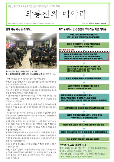 ‘와룡천의 메아리’로 명명한 대책위 이번 소식지는 △폐기물처리시설 반대 투쟁의 과정 △폐기장 건설 사업자의 움직임 △폐기물처리시설이 들어설 경우 환경·주민·지역사회에 어떤 영향을 끼칠지에 대한 분석 등을 상세히 기록했다.