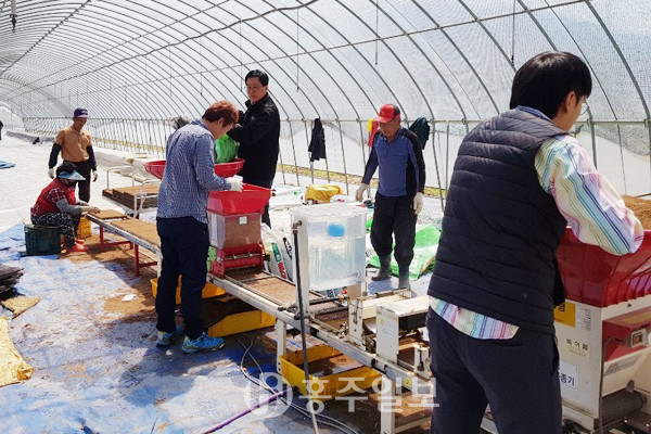 금마면행정복지센터 직원 10여 명은 노령 농가에 조금이나마 보탬이 되고자 바쁜 업무를 잠시 접어두고 지난 13일 금마면 덕정리 용당마을 김성태(72) 농가를 찾아 볍씨파종과 못자리 내기를 도우며 구슬땀을 흘렸다.