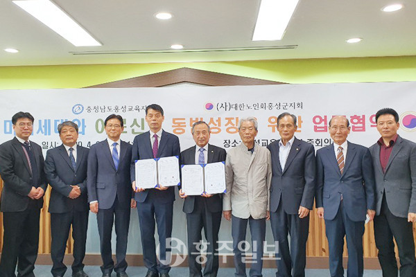 사)대한노인회 홍성군지회(지회장 조화원)는 충청남도 홍성교육지원청(교육장 주도연)과 지난 20일 업무 협약식을 갖고 어르신의 권익신장과 학생 인성교육의 균형적 발전을 위한 체험활동 지원체제를 구축해 나가기로 했다.